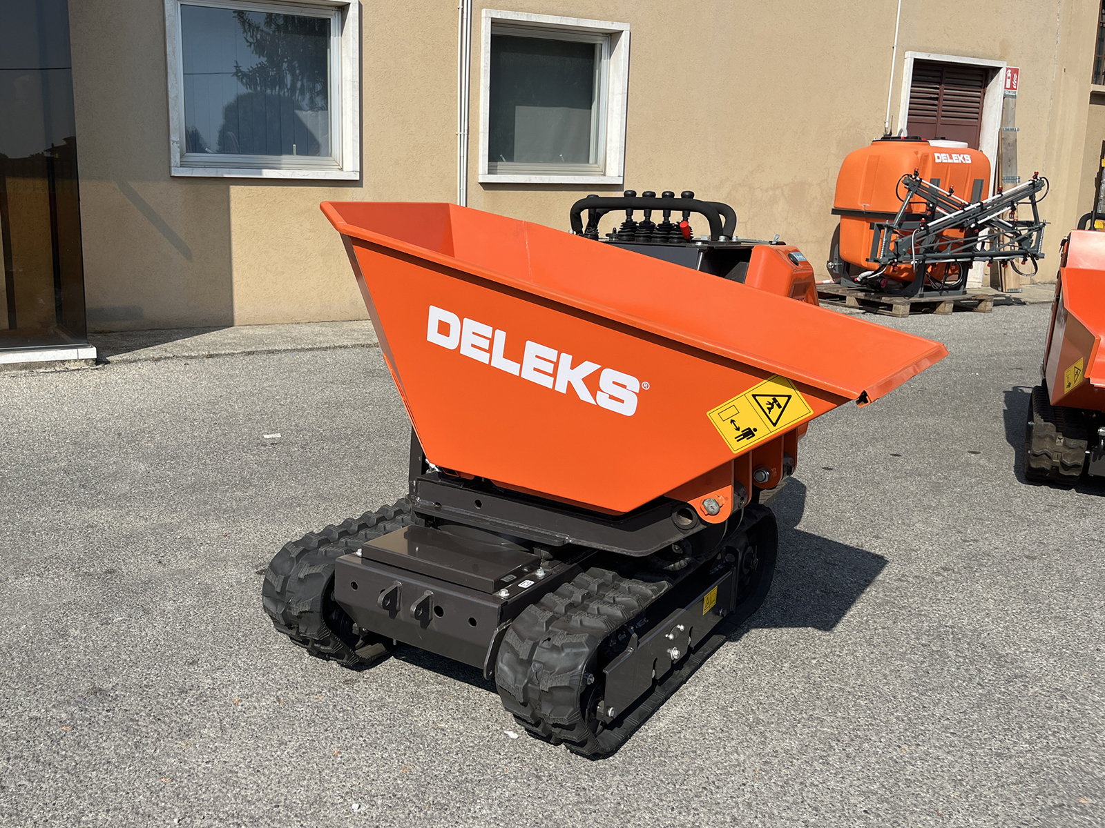 DELEKS® M8000R-KUBOTA Self-loading tracked minidumper, bucket with three-side unloading over 180° with hydraulic lift and rotation, locking valve on rotation, hydrostatic transmission, operator platform, Kubota engine, electric start.