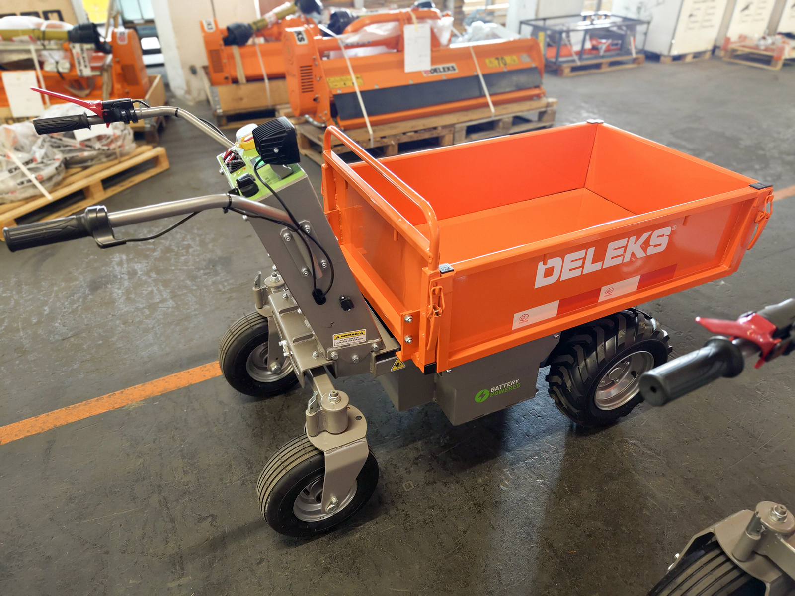 DELEKS® XE500HFL Lithium Electric Dumper with 1000W 48V electric motor, removable 48V 60Ah lithium battery, rectangular steel body with extendable side panels and hydraulic tipping.