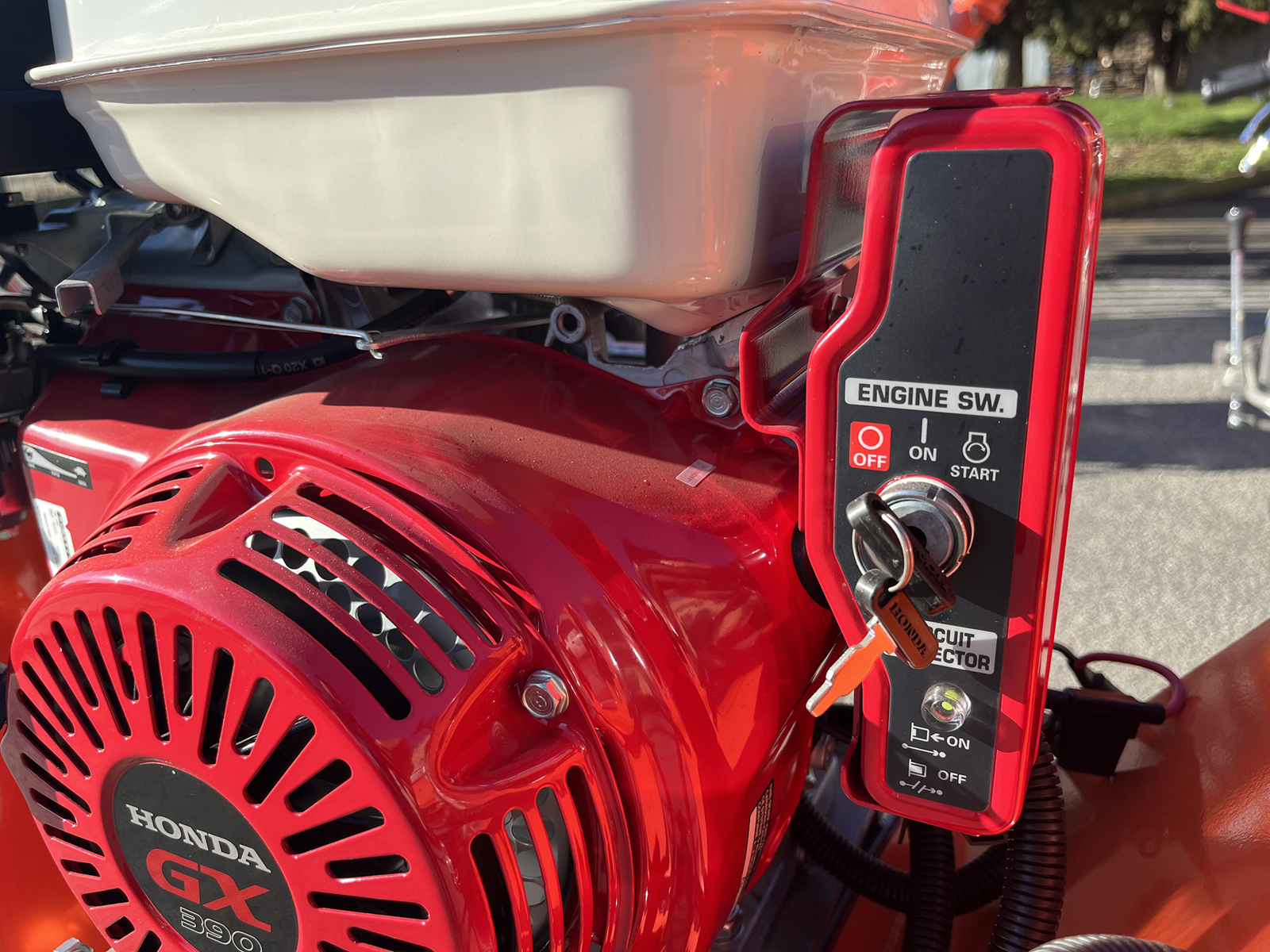 The machine is powered by a Honda GX390 petrol engine, 4-stroke, 389 cc, 13.5 HP, featuring electric key start and a manual emergency start, internationally recognised for reliability, durability and consistent performance under heavy loads.