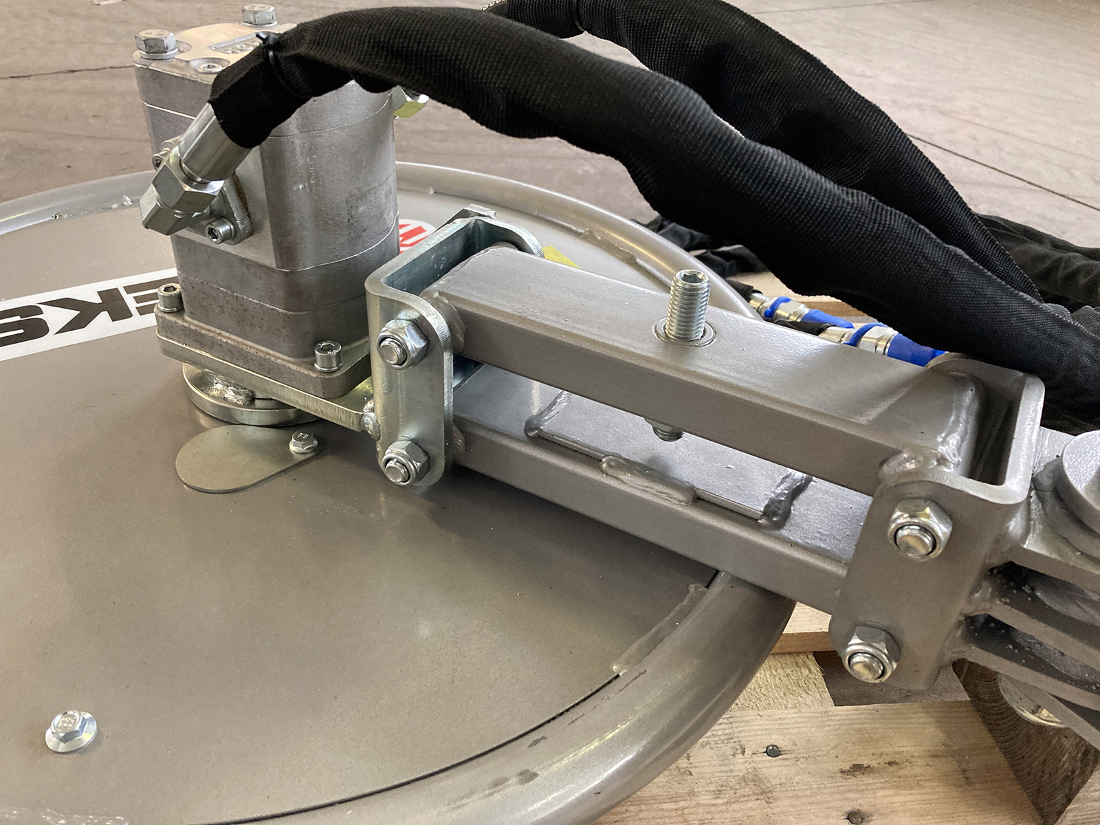 The attachment to the flail mower is composed by a parallel guide system, the base of the disc is leveling; these elements allow the disk to float and follow the uneven ground surface.