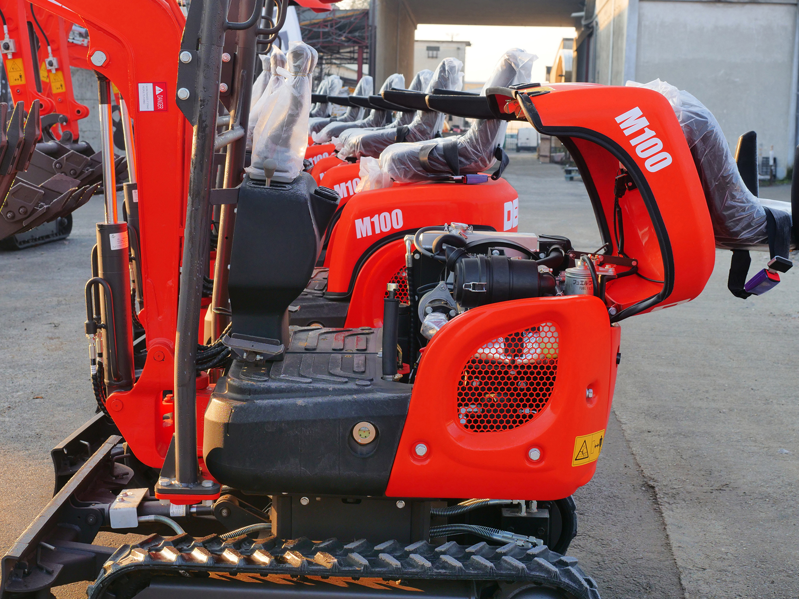 The DELEKS® M100 compact mini excavator (1 ton) is equipped with a Kubota D722 three-cylinder diesel engine, extendable undercarriage, and swing boom.