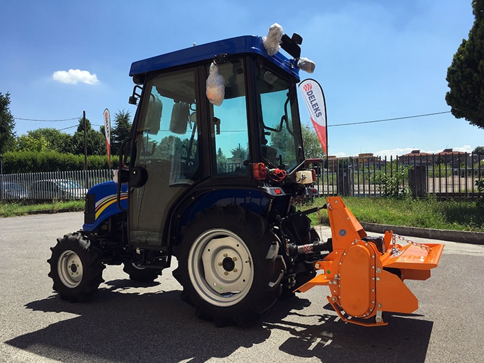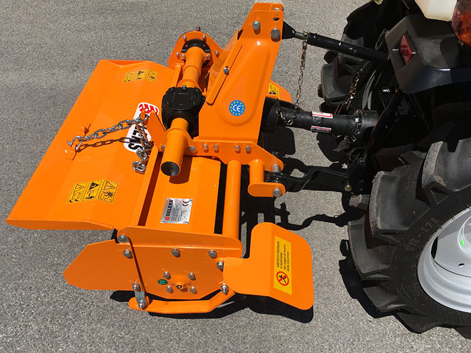 Light rotary tiller for tractors 12-35hp e.g Kubota B-BX, Iseki, Yanmar, Mahindra, Mitsubishi, Ferrari, New Holland Boomer 25, John Deere 2 Serie, etc. The tiller is attached to the tractor using universal three point linkage. Not suitable for lifting quick couplings.
