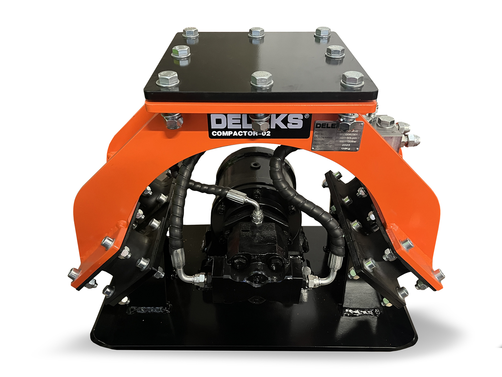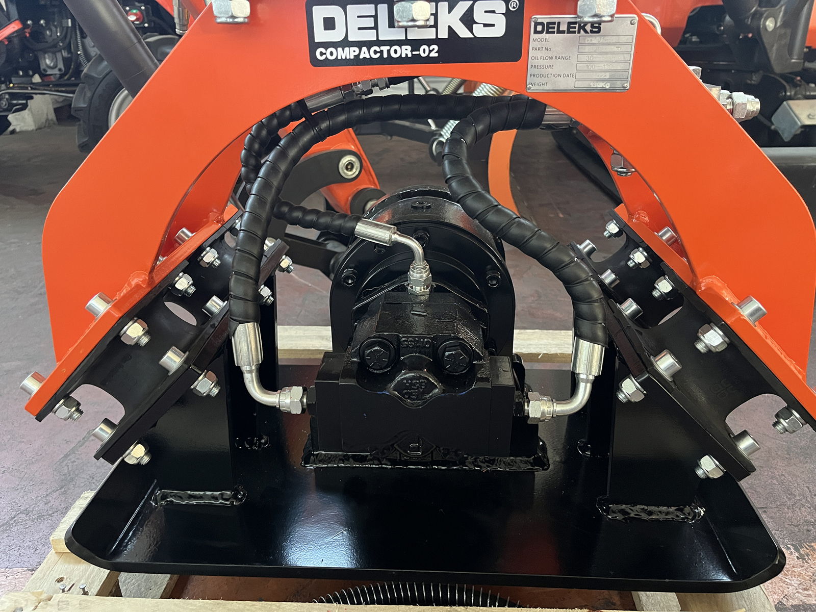 Plaque vibrante pour mini-pelle COMPACTOR-02 Deleks®, simple à installer et à utiliser, adaptée aux chargeuses compactes ou aux mini-pelles de 1 à 2,5 tonnes.