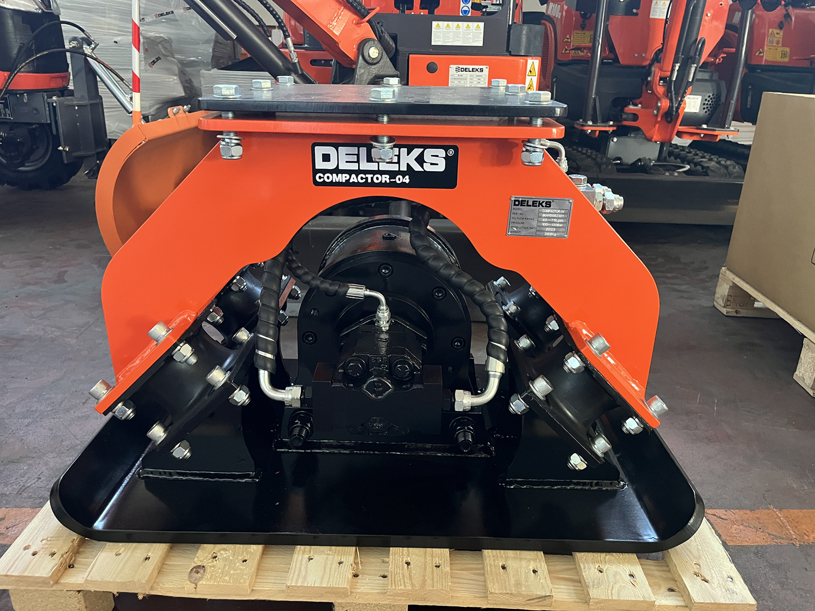 Plaque vibrante pour mini-pelle COMPACTOR-04 Deleks®, simple à installer et à utiliser, adaptée aux chargeuses compactes ou aux mini-pelles de 4 à 10 tonnes.