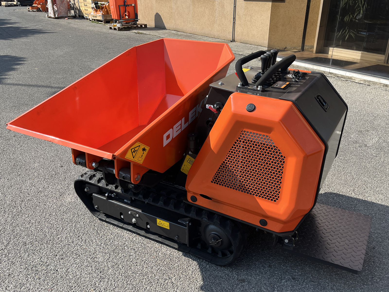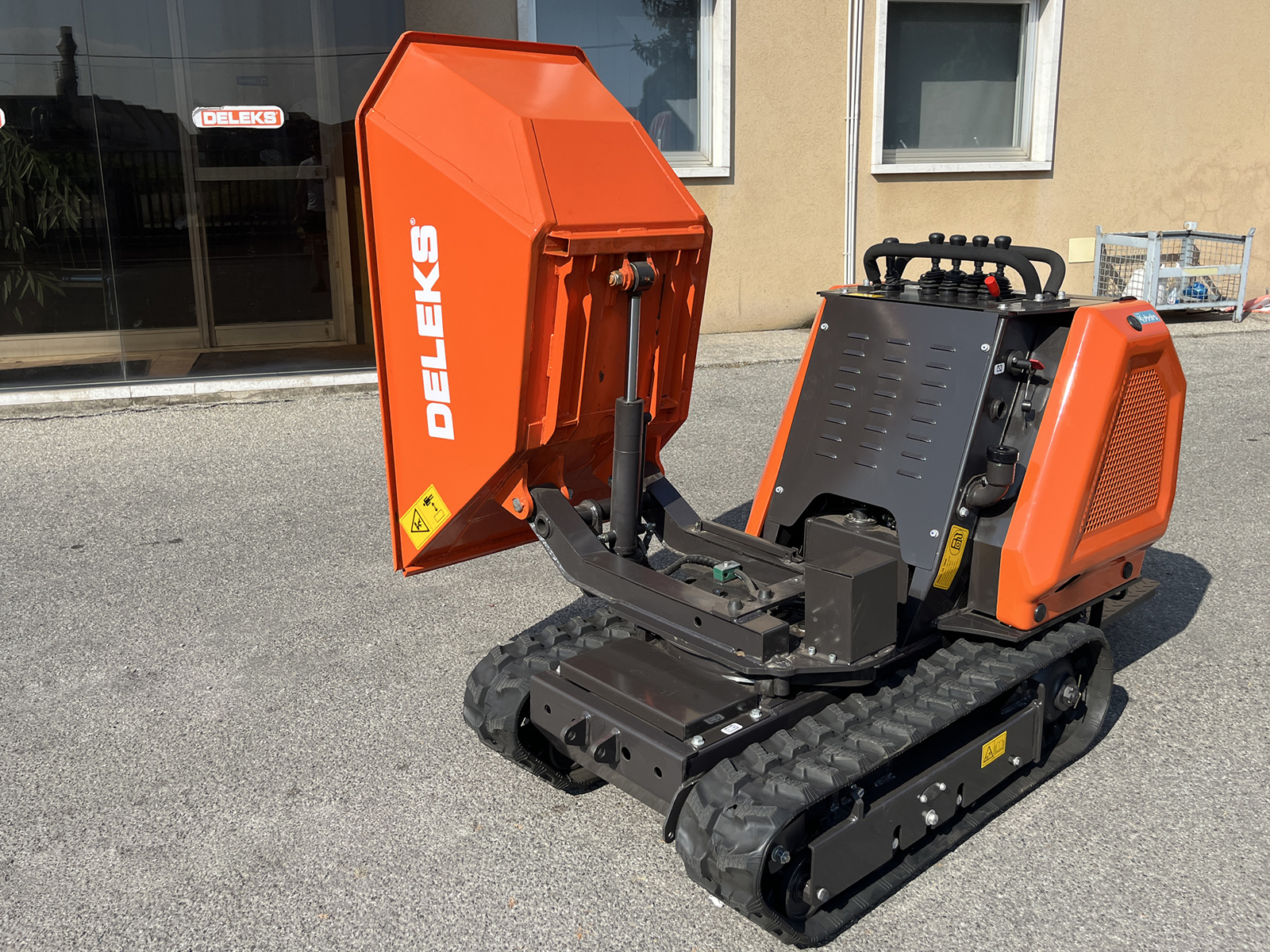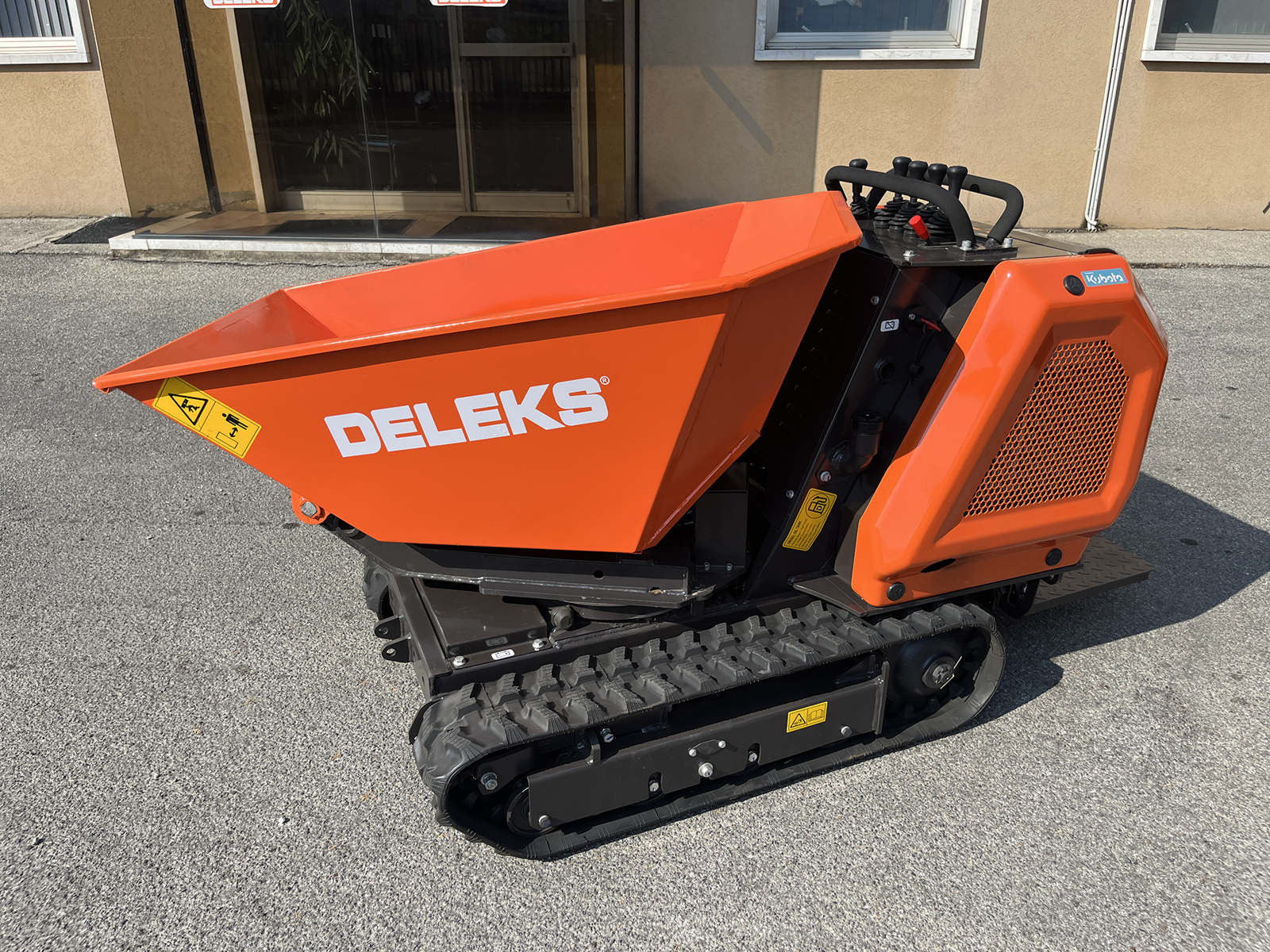 DELEKS® M8000R-KUBOTA mini-dumper sur chenilles professionnel avec déchargement trilatéral sur 180°, levage et rotation hydrauliques, transmission hydrostatique, plateforme opérateur et moteur diesel Kubota avec démarrage électrique.