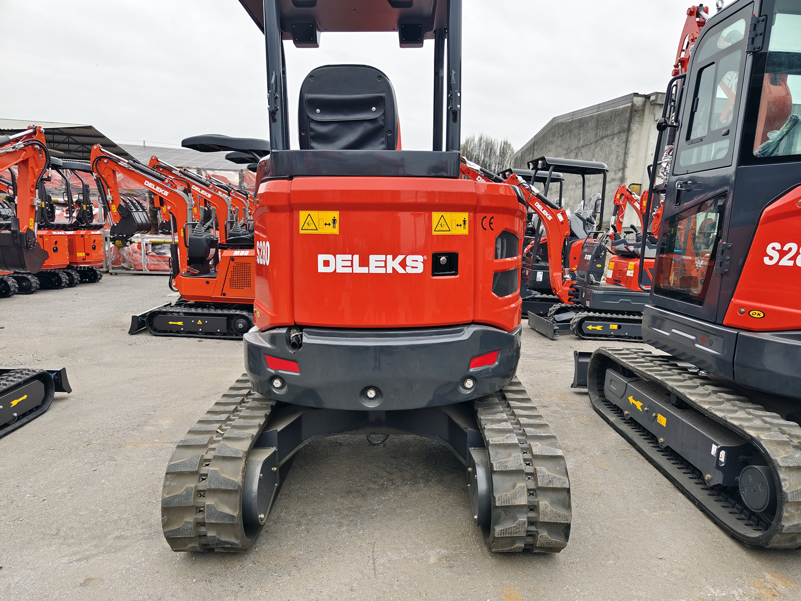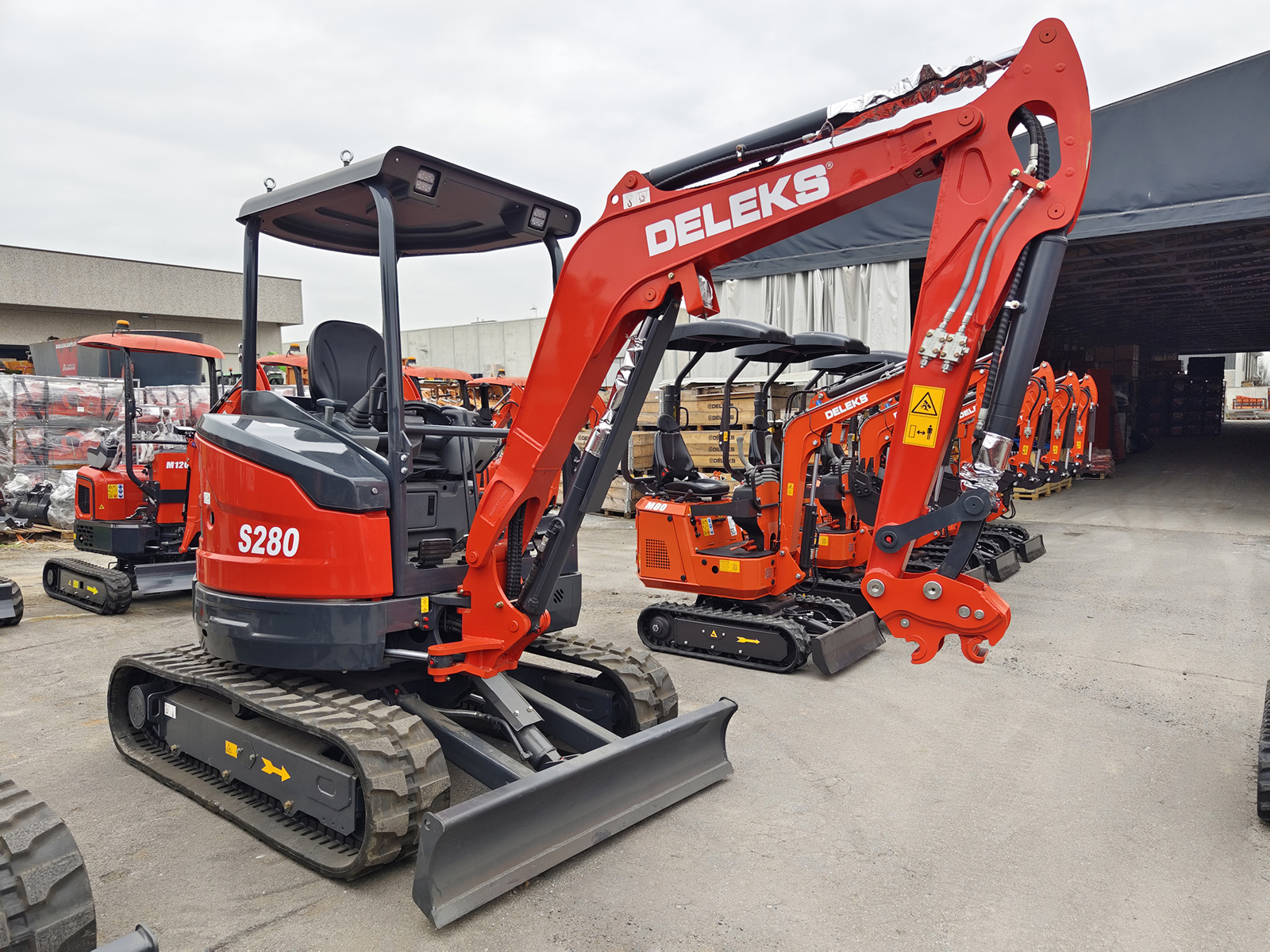 FERMERMini-pelle compacte DELEKS® S280-KUBOTA – 2.7 t — moteur Kubota D1105 Stage V à 3 cylindres (1123 cc), double vitesse jusqu’à 4 km/h, pompe hydraulique à pistons de 87 L/min avec contrôle Load Sensing, déport arrière nul, deux circuits AUX1–AUX2, bras déporté et valve de sécurité ISO 8643.