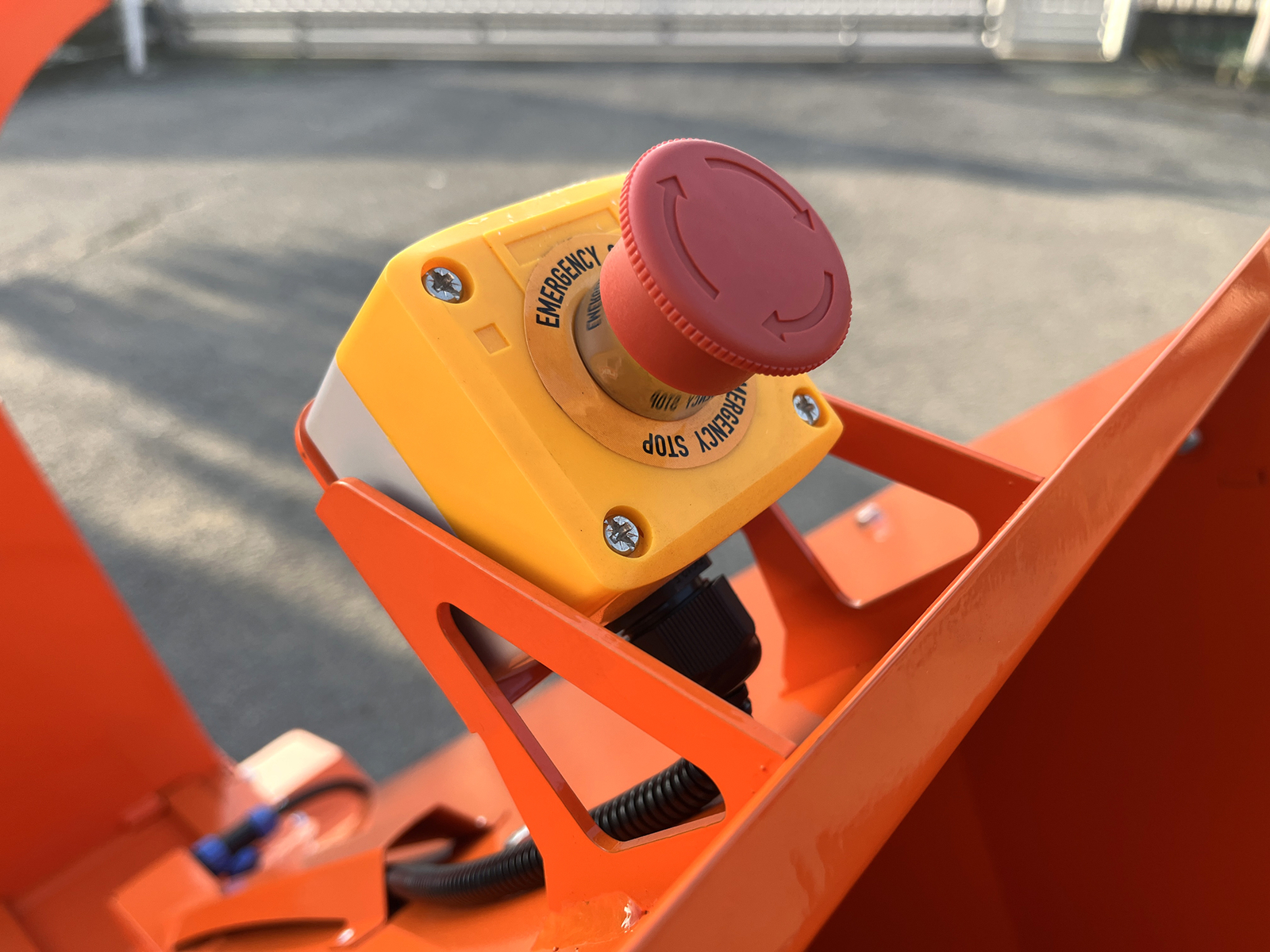 La machine est équipée d’un bouton d’arrêt d’urgence de type coup de poing permettant l’arrêt immédiat du moteur en cas de besoin. Un capteur de sécurité empêche le démarrage du moteur du broyeur si la goulotte d’éjection est démontée. La trémie d’alimentation est également repliable, évitant que le système de coupe reste exposé lorsque la machine est à l’arrêt ou en transport.