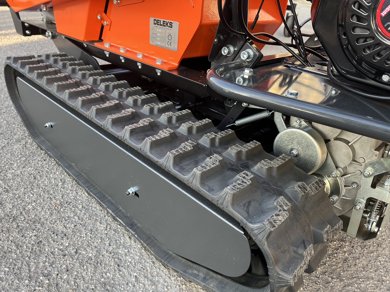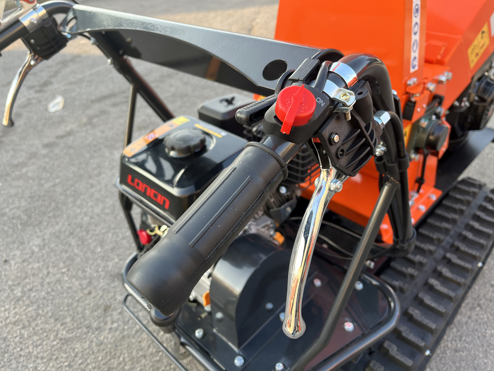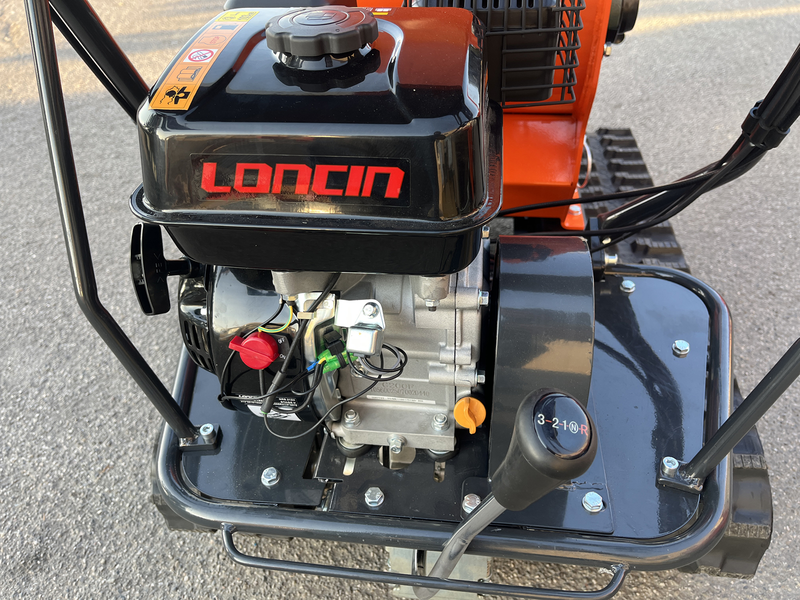 Le déplacement de la machine est assuré par une base chenillée entraînée par un moteur Loncin de 196 cc. La transmission dispose d’une boîte mécanique à 3 vitesses avant et 1 marche arrière, permettant d’adapter la vitesse aux conditions du terrain. La traction sur chenilles garantit adhérence et contrôle constants, même sur surfaces irrégulières ou en pente.
