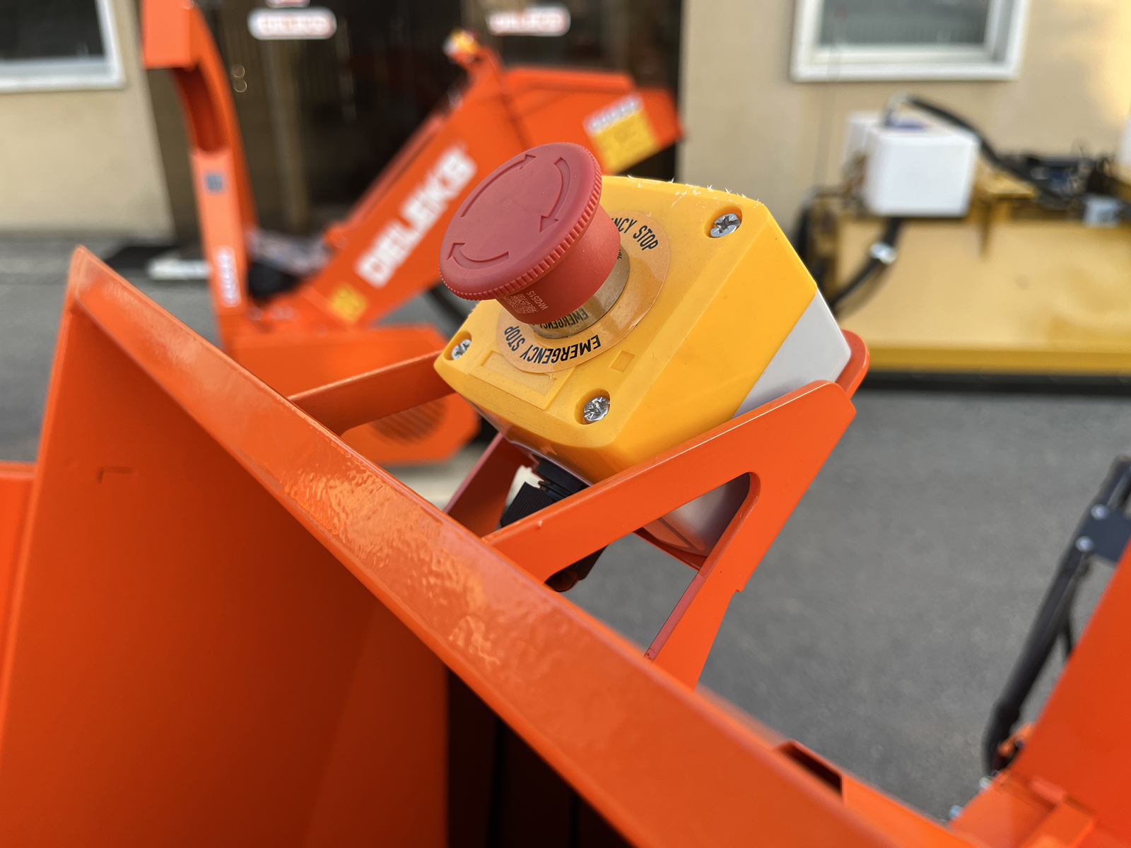 Le broyeur est doté d’un dispositif d’arrêt d’urgence de type coup de poing permettant l’arrêt immédiat du système de coupe. La trémie d’alimentation peut être repliée afin d’éviter l’exposition du système de coupe lorsque la machine est à l’arrêt ou en transport. Les protections sont conformes aux normes en vigueur.