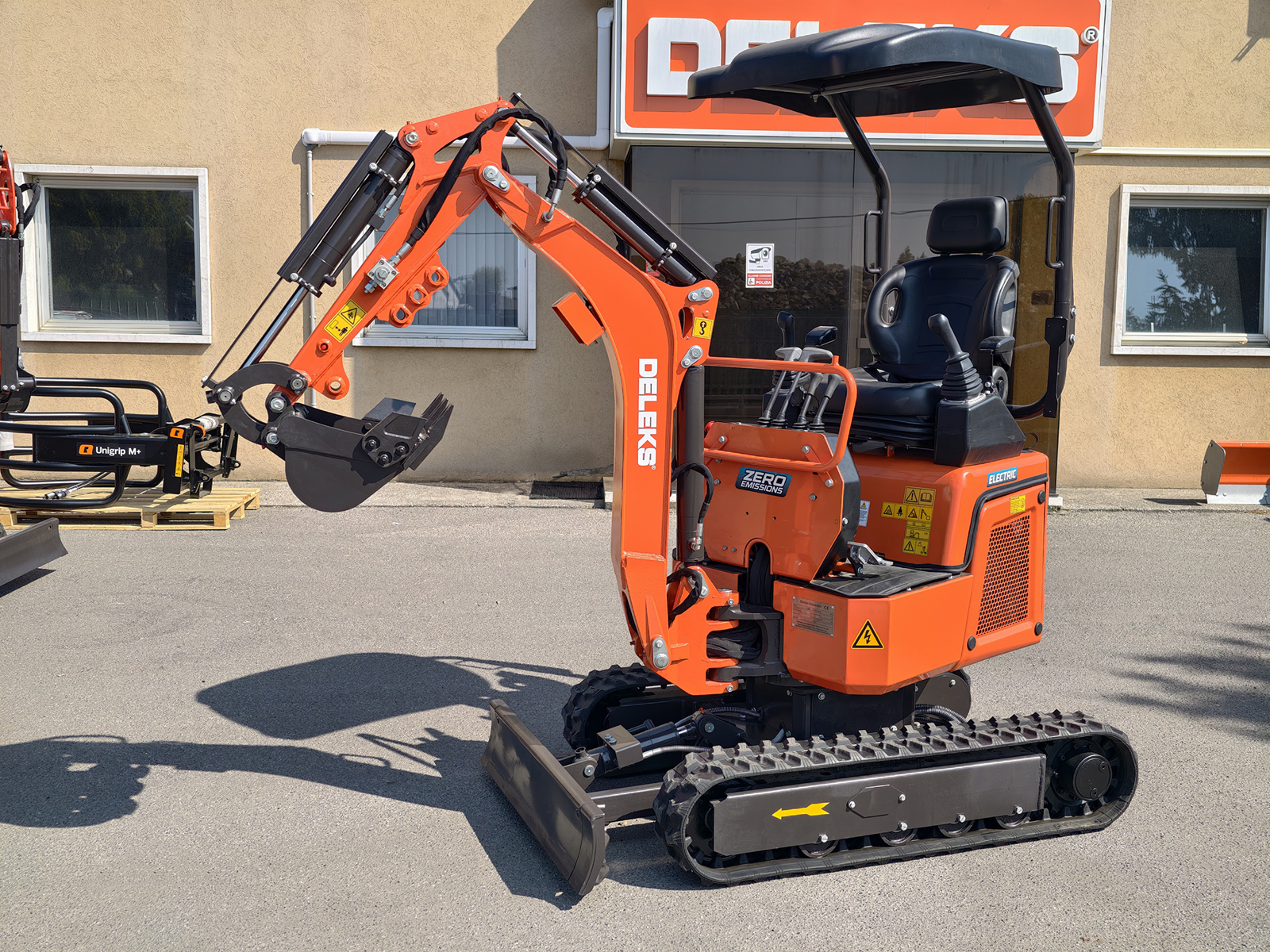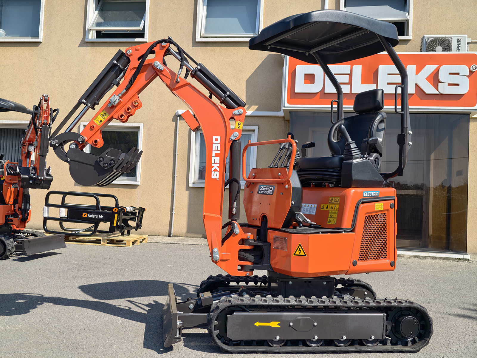 FERMERMini-pelle 100% électrique DELEKS® E120 (1,2 tonne) avec train de roulement extensible, pompe à pistons, double vitesse de translation et cinématique avancée, conçue pour offrir précision, puissance d’excavation et efficacité maximale en milieux urbains, résidentiels et à zéro émission.