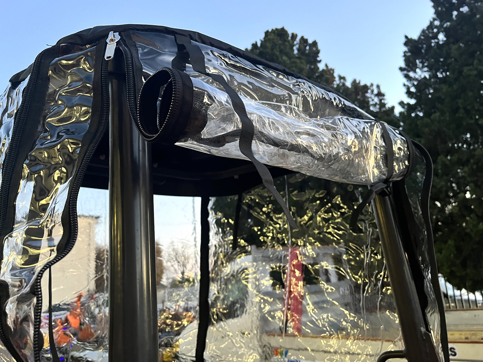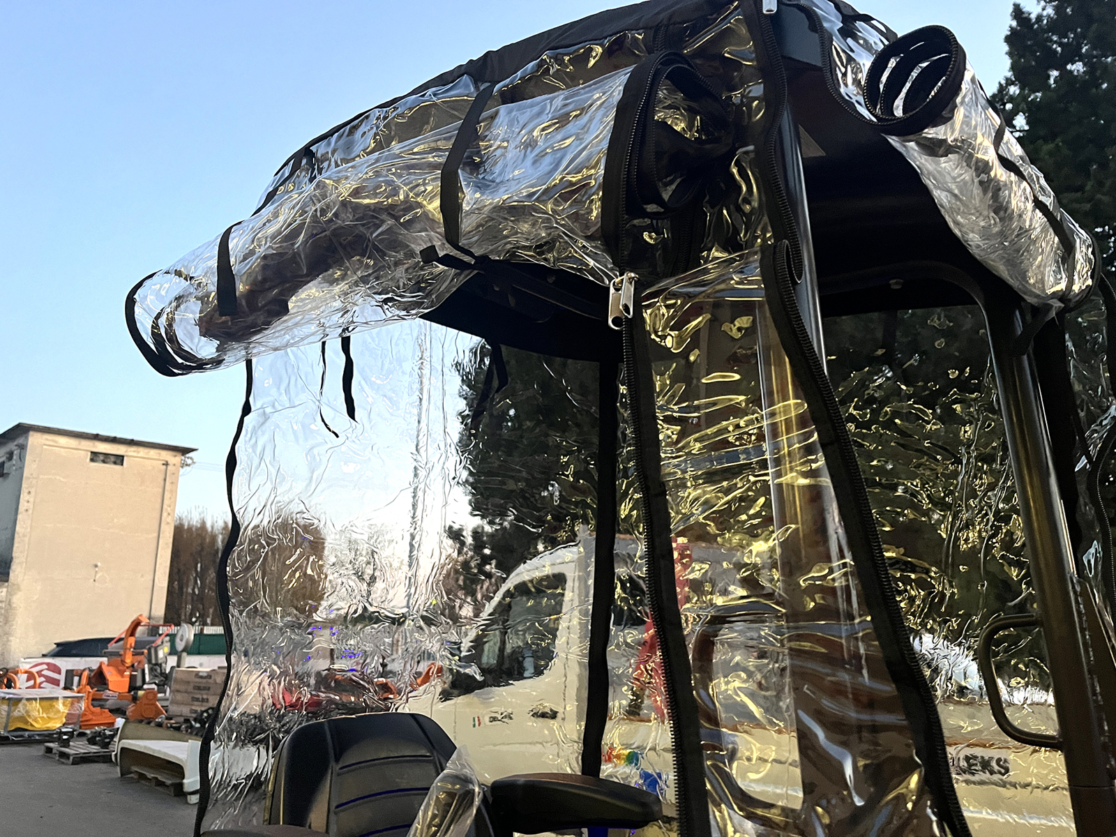 Cet accessoire n’est ni recommandé ni conçu pour la protection contre le soleil ou pour une utilisation prolongée en plein soleil. Le matériau, étant transparent et principalement axé sur l’imperméabilité, peut en effet accentuer l’effet de serre à l’intérieur de la cabine (augmentant fortement la température) et subir un vieillissement prématuré (décoloration ou fissures) en raison d’une exposition continue et directe aux rayons UV.